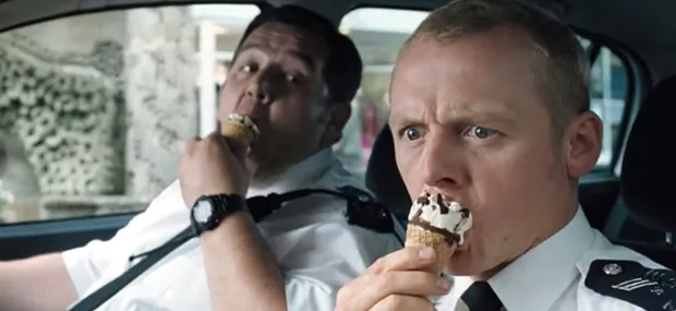 As this is the second part of the Cornetto Trilogy, the blue wrapper makes its appearance in the film. Nick and Danny are seen eating vanilla flavor ice cream. According to Edgar Wright, blue represents the police, which is the main motif in the film. For Wright's other films, Shaun of the Dead (2004), it was red and strawberry flavor, representing blood and zombies, while the final part, The World's End (2013), it was green and peppermint with chip, representing science fiction and extraterrestrial elements.